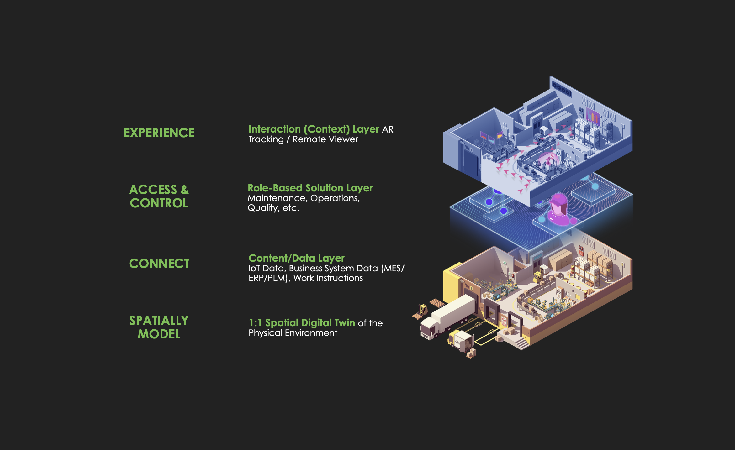 - Facilitating relevant data & content to be spatially organized & accessible in the right place & at the right time (data/content could be IoT, PLM, ERP, MES, Documentation).