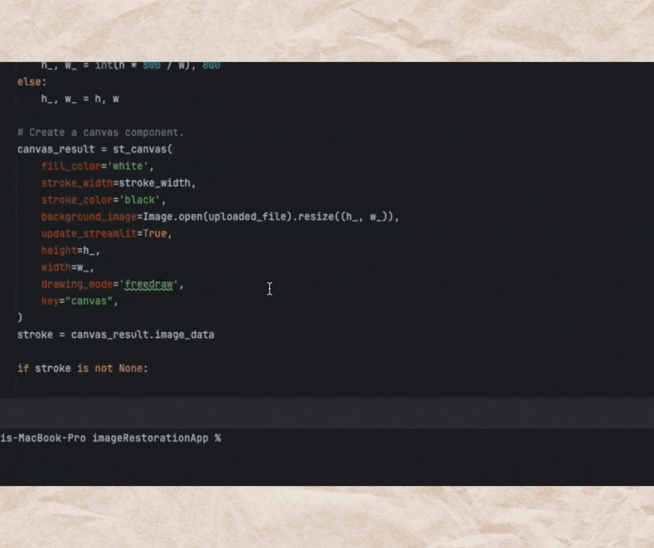 In this project, I developed a Streamlit application that restores old photos by digitally repairing damages like scratches. Users can upload a photo, directly paint over imperfections on a drawable canvas, and choose from advanced inpainting algorithms—Navier Stokes (NS) and Fast Marching Method (Telea)—to seamlessly blend repairs. The final restored image can be previewed and downloaded directly. This tool simplifies photo restoration, making it accessible without needing complex software.